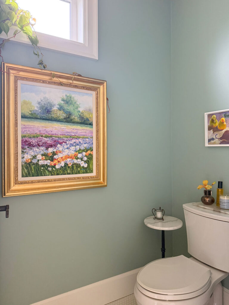 And the beauty of a timeless white bathroom is that can add any colour you want. Just for fun, I photoshopped my water closet in an earthier green (below). So pretty, right?