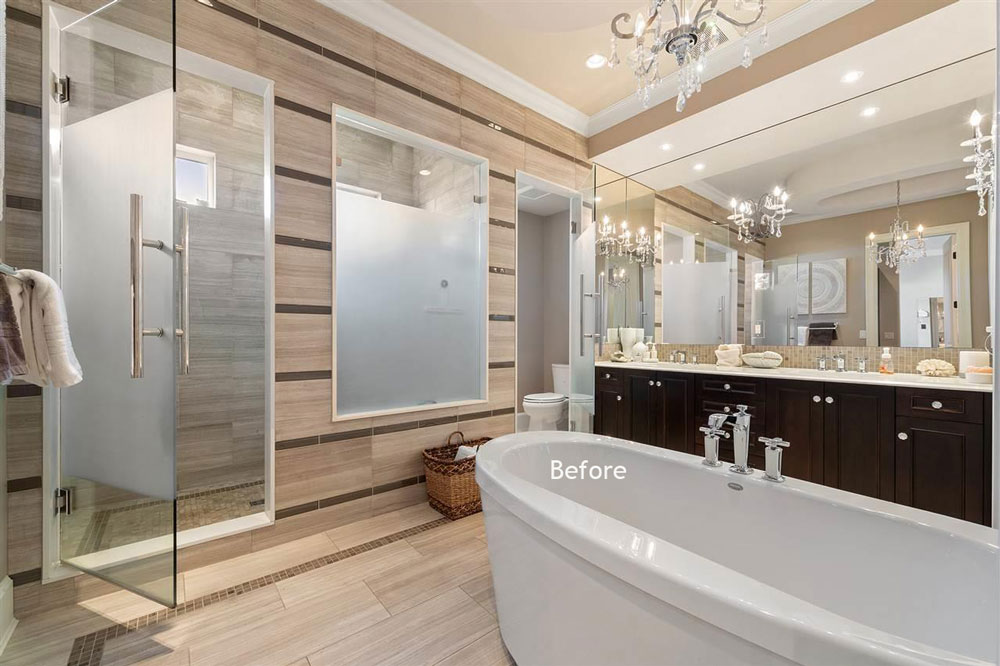 This was the before. The shower has the glass door on the left in the photo below. And the water closet is the glass door on the right. The tub in this room was located in between two open doorways. We swapped the placement of the tub and shower (below). And we created a proper closing doorway.