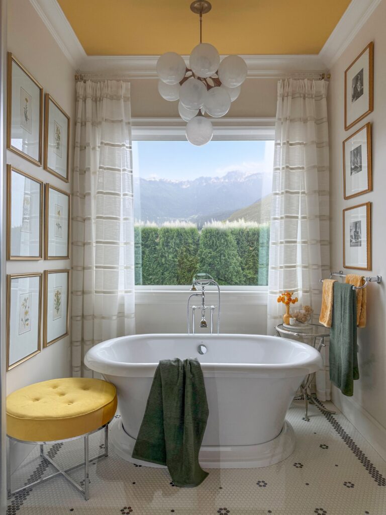 Truly stunning bathroom. I love the yellow ceiling. I’m not brave enough for a vibrant ceiling color, but I love it here.