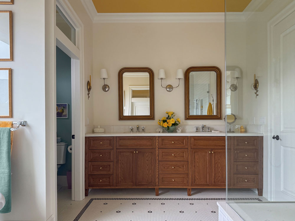 A warm wood vanity is the perfect way to add warmth to a timeless white bathroom and I repeated the warmer tones with the arched mirrors.